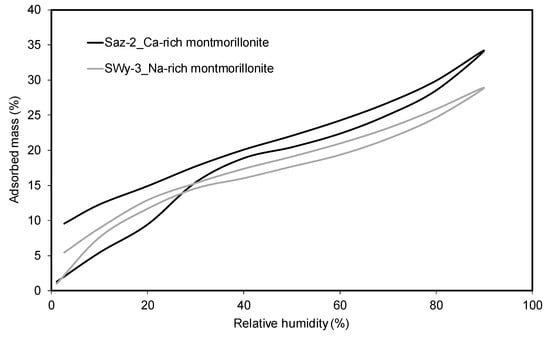 Figure 11 shows water vapor sorption evolution of the reference samples. It is observed that calcium-rich montmorillonite presents a higher sorption capacity, possibly related to its enrichment in swelling mineral content, but also because of the cation-rich effect.