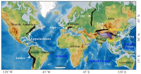 A map illustrating the major linear orogenic belts of the world []. The Qinling orogenic belt serves as the watershed between the Yellow and the Yangtze Rivers, two major large rivers in China.