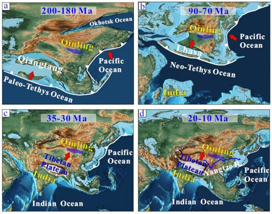Maps depicting the Mesozoic and Cenozoic evolution of the Qinling Shan (http://www.earthbyte.org/paleomap---paleoatlas---for---gplates/, accessed on 10 August 2023): (a) the initial geological framework of the Qinling Shan was established during the early Mesozoic period when the South China Block collided with the North China Craton []; (b) in the Late Cretaceous, the Pacific Plate subducted beneath the Asian continent, resulting in the reactivation of the Qinling Shan []; (c) the far-field effects of the Eocene collision between the Indian Plate and the Asian continent influenced the Qinling Shan []; (d) in the late Cenozoic era, the Qinling Shan experienced further exhumation and became the watershed between the Yellow and the Yangtze Rivers []. The red arrows indicate the plate movement direction.