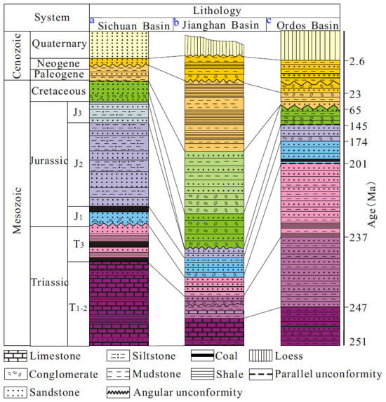 The main sedimentary basins surrounding the Qinling Shan include the (a) Sichuan Basin [], (b) Jianghan Basin [], and (c) Ordos Basin []. There is an angular unconformity observed between the Lower Jurassic and Upper Triassic formations in the Sichuan Basin []. The conglomerate layers have been identified in the Lower Jurassic strata of the Jianghan Basin []. A parallel unconformity between the Lower Jurassic and the underlying strata has been observed in the Ordos Basin []. The Upper Cretaceous strata are absent in the Sichuan and Ordos Basins, whereas thick conglomerates are present in the Jianghan Basin. In the Sichuan and Jianghan Basins, there is an angular unconformity between the Neogene and Paleogene strata. In the late Neogene strata of the Ordos Basin, conglomerates and angular unconformities can be observed [,].