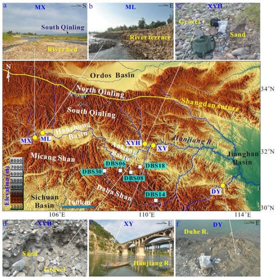 - Xie, W.; Wang, X.; Zhang, H.; Liu, Q.; Wang, S.; Lu, H. Drainage evolution in intermontane basins at the Qinling-Daba Mountains. Sci. China Earth Sci. 2021, 64, 1949–1968. [Google Scholar] [CrossRef]