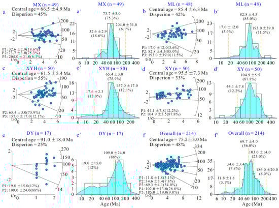 Detrital apatite fission-track results were obtained for modern samples collected from the Hanjiang River: (a–f) depict the single-grain age data in radial plots on the left and the grain-age distribution in terms of probability plots and kernel density estimates on the right (a′–f′). Both plots were generated using Density Plotter (Vermeesch []). As shown in (f,f′), the ages of individual grains from various rivers were combined.