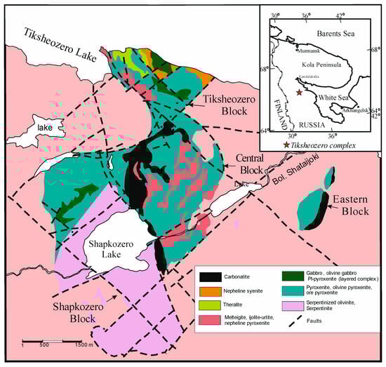 Geological scheme of the Tiksheozero complex (modified after [7]). Inset indicates its geographical position.
