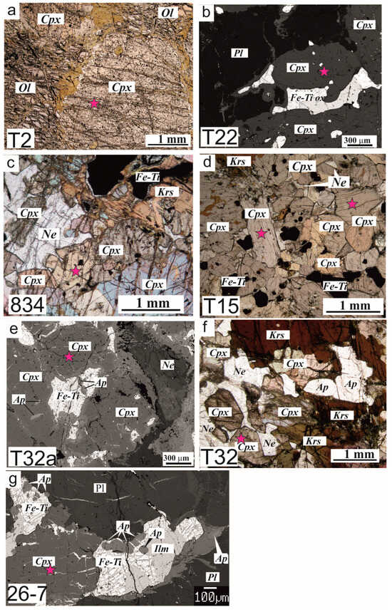 Microphotos ((a,c,d,f), parallel nicols) and BSE images (b,e,g) of the studied rocks of the Tiksheozero complex. Asteriks show analyzed spots. Mineral abbreviations: (Ol) olivine, (Cpx) clinopyroxene, (Pl) plagioclase, (Ap) apatite, (Ne) nepheline, (KFs) K-Feldspar, (Krs) kaersutite, (Fe-Ti) Fe-Ti oxides, and (Ilm) ilmenite.