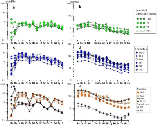 Trace-element and REE distribution patterns for clinopyroxenes of the Tiksheozero complex: (a,b) ultramafic–mafic rocks, (c,d) foidolites, (e,f) theralites, nephelibe syenites, and carbonate–silicate rocks. Concentrations are normalized to chondrite and primitive mantle after [10].