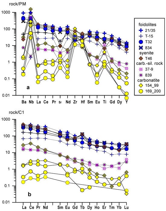Primitive mantle-normalized patterns (Figure 6a,c) of alkaline rocks and carbonatites have a similar shape with negative anomalies of Nb, Zr-Hf, and Ti. However, apatites from carbonatites have deeper anomalies of Zr-Hf and Nb. They also have lower Th, U, and Pb contents compared to the rocks of alkaline series. Apatites in the rocks of alkaline series have high Th and Pb contents (Figure 6a). The spidergram of apatite from carbonate–silicate rocks is close to that of alkaline rocks.