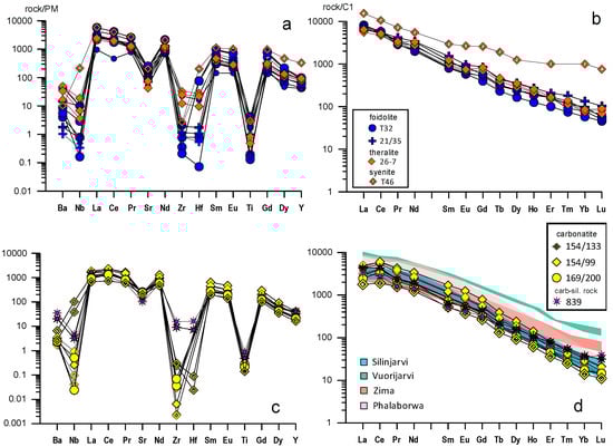 REE and trace-element distribution in the apatites from alkaline silicate (a,b) and carbonate–silicate rocks and carbonatites (c,d) of the Tiksheozero complex. Concentrations are normalized to chondrite and primitive mantle after [10]. Fields shown in (d) were plotted using data from [12,13,14,15].