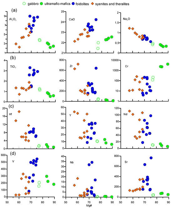 In all the variation diagrams, there is a gap between clinopyroxenes from ultramafic low-alkali and alkaline rocks, which is most significant in the Al2O3, TiO2, and Cr-Mg# diagrams (Figure 8a,b) and for some incompatible elements (Nd, Hf, Zr, and others) (Figure 8c,d), which are low in the ultramafic rocks. In the Na2O-Mg# diagram (Figure 8a), the rocks define a single trend. It should be noted that in some diagrams, the data points of clinopyroxene from gabbroic rocks partly fill this gap, approaching compositions of clinopyroxenes from alkaline rocks.