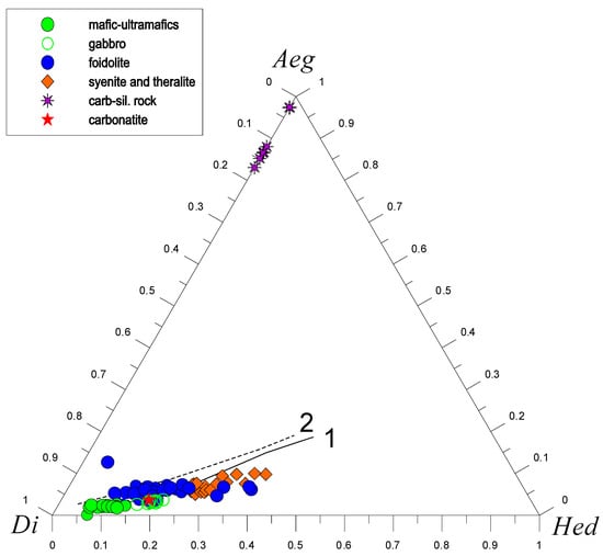 Compositions of clinopyroxenes from the rocks of the Tiksheozero massif in the Di–Hed-Aeg diagram. Variation trends of clinopyroxenes shown for comparison: (1) Jacupiranga, Brazil; (2) Banhadao, Brazil [16,17]. Major element compositions of clinopyroxenes are listed in [5].