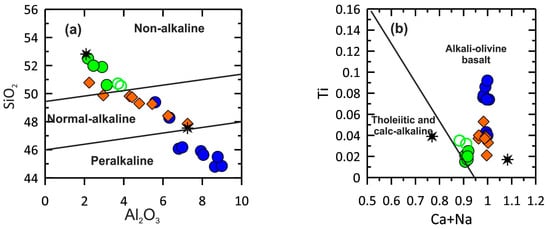 Variations in Ti vs. Ca+Na (a) and SiO2 vs. Al2O3 (b) for clinopyroxenes from rocks of the Tiksheozero complex. Fields after [18,19]. For symbols, see Figure 9.