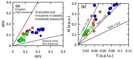 AlVI vs. AlIV (a) and Al-Ti (b) diagrams for clinopyroxenes from the rocks of the Tiksheozero complex. Fields after [20]. For symbols, see Figure 9.