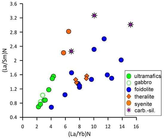 The obtained data allowed us to shed light on the petrology of the complex, some genetic aspects of the relations between the alkaline silicate phases of the complex, and to propose a genetic model of their formation [5]. Two alternative models of the formation of the low-alkali ultramafic–mafic and alkaline phases of the massif were proposed: (1) from a single mantle source through successive two-stage melting and (2) three-stage model related to the ascent and melting of the mantle plume [6]. However, relations of the silicate and carbonatite phases, origin of carbonatites, as well as their evolution, remained beyond the scope of these works. In addition, many questions regarding the genetic relationship of the ultramafic part of the massif with alkaline magmas remained incompletely solved. In this work, these problems are discussed using first obtained in situ LA-ICP-MS data on minerals from all intrusive phases of the Tiksheozero complex in combination with previously obtained microprobe and geochemical studies ([5,6]).