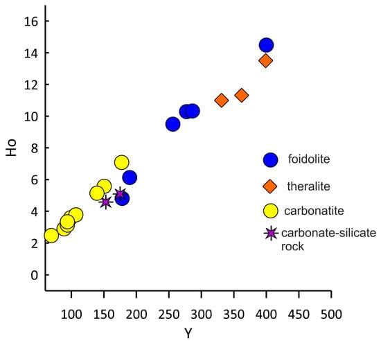 - The absence of signs of liquid immiscibility in combination with a common trend of apatites from alkaline rocks and carbonatites in the Y–Ho diagram, a decrease in the Y/Ho ratio in apatites from foidolites to carbonatites, and different trace-element compositions of apatite in silicate rocks and carbonatites, as well as the accumulation of incompatible elements in apatites from carbonatites, serve as arguments in support of their origin through fractional crystallization rather than through liquid immiscibility.