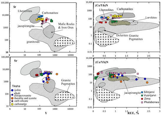 Apatites from the studied complex were compared to those from analogous complexes worldwide of a different age in an attempt to reveal whether ancient carbonatite complexes have a peculiar composition. As mentioned above, the Tiksheozero is the world’s oldest complex containing the entire spectrum of rocks from ultramafic cumulates through foidolites and syenites, and theralites to carbonatites. Carbonatite complexes of close ages usually have a more narrow rock spectrum. In particular, the oldest Neoarchean Siilinjärvi complex (2613 ± 18 Ma, [32]) also located at the Karelian craton consists exclusively of rocks of the glimmerite–carbonatite series [33], whereas rocks of the foidolite and syenite series are absent. The Phalaborwa massif of a similar age ~2.06 Ma [34], in addition to carbonatites, also contains pyroxenites and phoscorites, as well as nearby syenite dikes [14,34], but are devoid of foidolites. The Belaya Zima carbonatite complex with an age of 645 ± 6 Ma [15] and Vuorijärvi intrusion with an age between 375 ± 7 and 383 ± 7 Ma [35] were taken as the younger analogues. The Belaya Zima complex consists of carbonatites, foidolites, and nepheline syenites [15]. The Vuorijärvi intrusion is located on the Kola Craton and includes the wide rock spectrum: ultramafic cumulates (wehrlites, dunites, clinopyroxenites), foidolites, and carbonatites. It can be seen in Figure 6d that the REE patterns of apatites from carbonatites of the Tiksheozero complex are almost completely overlapped with those of the oldest Silinjärvi complex. Apatites from carbonatites of the Phalaborwa massif have a higher REE level with a similar shape in the REE pattern. At the same time, the younger carbonates from the Zima and Vuorijärvi complexes differ in the lower degree of REE fractionation with higher HREE contents. The difference between older and younger (<1 Ga) carbonatites was mentioned by [36] based on the study of Nd, Hf, and S isotopic composition. These authors related this difference in an increase in the recycled crustal component owing to the transition to the modern plate tectonics at a lower geothermal gradient during Late Proterozoic [37]. As also seen in the diagrams proposed in [38], especially in (Ce/Yb)n –REE, %, apatites from carbonatites of the Tiksheozero complex resemble apatites from ancient Phalaborwa and Sillinjärvi massifs, whereas apatites from silicate rocks show no such tendency (Figure 14).