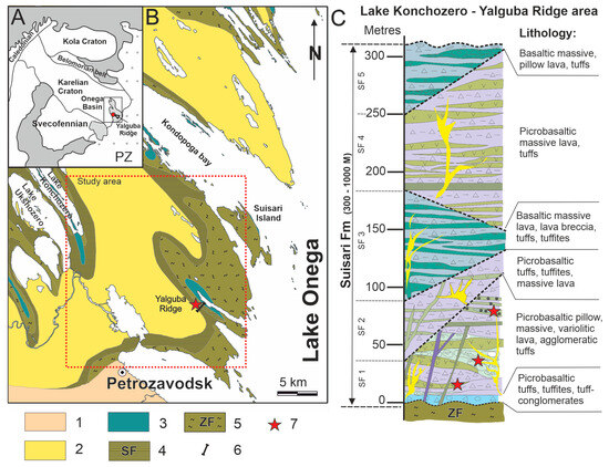 - Kulikov, V.S.; Rychanchik, D.V.; Golubev, A.I.; Filippov, M.M.; Tarkhanov, G.V.; Frik, M.G.; Svetov, S.A.; Kulikova, V.V.; Sokolov, S.Y.; Romashkin, A.E. Stratigraphy and magmatism. Ludicovian. In Paleoproterozoic Onega Structure: Geology, Tectonics, Structure, and Metallogeny; Glushanin, L.V., Sharov, N.V., Shchiptsov, V.V., Eds.; Karelian Research Centre, RAS: Petrozavodsk, Russia, 2011; pp. 67–101. (In Russian) [Google Scholar]