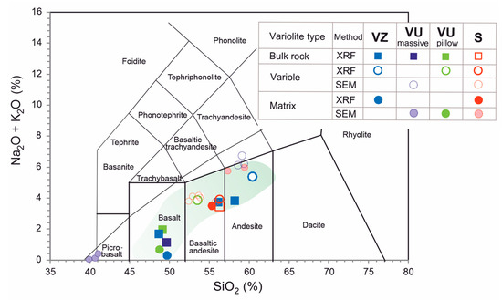 - Pugin, V.A.; Hitarov, N.E. Variolites as an example of the magmatic liquation. Geochemistry 1980, 4, 496–512. [Google Scholar]