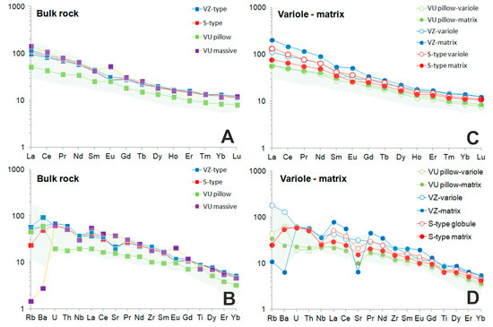 - Sandsta, N.R.; Robins, B.; Furnes, H.; de Wit, M. The Origin of Large Varioles in Flow Banded Pillow Lava from the Hooggenoeg Complex, Barberton Greenstone Belt, South Africa. Contrib. Mineral. Petrol. 2011, 162, 365–377. [Google Scholar] [CrossRef]