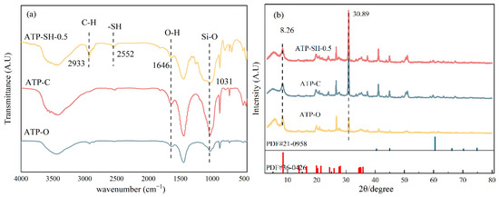 Figure 3a shows the Fourier Transform Infrared (FTIR) spectra of ATP-O, ATP-C, and ATP-SH-0.5. The similarity in the structures of ATP-O and ATP-C suggested that calcination did not cause significant changes to the surface functional groups. The broad absorption peak observed at approximately 1646 cm−1 was attributed to the O-H bending vibration between the interlayers of the attapulgite. The peak observed at 1031 cm−1 was associated with the stretching vibrations of Si-O-Si. In comparison to ATP-C, the intensity of this peak was observed to decrease in ATP-SH-0.5. This suggested that the Si-O-Si bond in the lattice of ATP was hydrolyzed and broken into a large number of Si-O bonds during the modification process [20]. The successful synthesis of ATP-SH-0.5 was confirmed by the appearance of absorption bands at 2933 cm−1 and 2552 cm−1, which corresponded to the stretching vibrations of C-H and -SH, respectively, due to the presence of the organic layer [21]. In addition, Figure 3b depicts the X-ray diffraction (XRD) patterns of ATP-O, ATP-C, and ATP-SH-0.5. All three samples exhibited characteristic diffraction peaks at 2θ = 8.26, corresponding to the (110) crystal plane of goethite. No significant differences in the positions and spacing (d) of the characteristic diffraction peaks were observed between ATP-O, ATP-C, and ATP-SH-0.5, indicating that the crystal structure and crystallinity of ATP-SH-0.5% remained largely unchanged [22]. The characteristic peaks of quartz were also observed in the goethite structure.