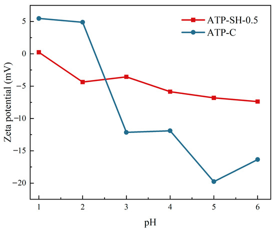 The determination of Zeta potential can explain the effect of surface charge on the adsorption of adsorbents. The Zeta distribution diagrams of ATP-C and ATP-SH-0.5 are shown in Figure 5. ATP-C exhibited an isoelectric point at pH 1.07 within the pH range of 1–6. ATP-SH-0.5 was positively charged at pH 1–2 and gradually became negative with increasing pH, resulting in an isoelectric point at pH 2.3. Compared to ATP-C composite materials, ATP-SH-0.5 had more negative surface charges and a stronger surface adsorption capacity for cations.