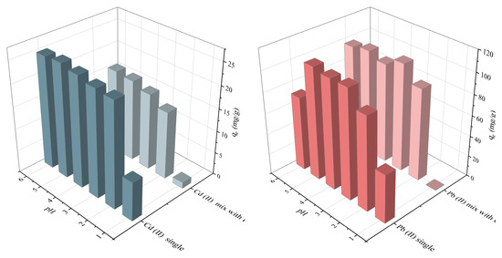 The pH gradient was adjusted based on the characteristics of the heavy metals. As Pb (II) can precipitate at pH values above 7, the effect of pH on the adsorption of Cd (II) and Pb (II) was evaluated by varying the initial pH from 1 to 6 using 0.1 mol/L NaOH and 0.1 mol/L HNO3 solutions in both single and binary metal ion systems with iron.