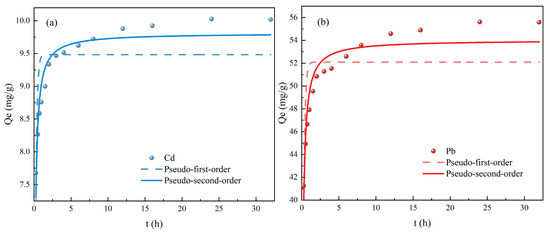 Adsorption kinetics for the adsorption of Cd (II) (a) and Pb (II) (b) in a binary heavy metal ion system.