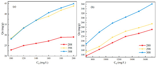 To explore the maximum possible adsorption capacity of ATP-SH-0.5, different initial concentrations of Cd (II) and Pb (II) were evaluated in binary systems (Figure 8). As the initial concentrations of Cd (II) and Pb (II) increased, the adsorption capacity gradually increased until saturation was reached. The theoretical saturated adsorption capacities of ATP-SH-0.5 for Cd (II) were 32.50 mg/g, 44.32 mg/g, and 47.25 mg/g, and for Pb (II) were 430.44 mg/g, 389.70 mg/g, and 406.1673 mg/g at temperatures of 288 K, 298 K, and 308 K, respectively. In the binary competitive adsorption system, the affinity of ATP-SH-0.5 for Pb (II) was greater than that for Cd (II), indicating that ATP-SH-0.5 had a greater advantage in adsorbing Pb (II). Table 5 shows the results of adsorption of Cd (II) and Pb (II) on different sulfhydryl functionalized materials at 298 K. The theoretical adsorption capacity of ATP-SH-0.5 was significantly enhanced compared to mercapto-functionalized unpurified attapulgite [32] at 298 K. Compared to mercapto-functionalized other clay minerals, ATP-SH-0.5 demonstrated good adsorption efficiency for Cd (II) and superior adsorption efficiency for Pb (II) [12,16,32,33,34,35].