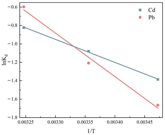 To investigate the adsorption types of Cd (II) and Pb (II) by ATP-SH-0.5, the thermodynamic parameters of the adsorption process were calculated. The effect of temperature on the adsorption of Cd (II) and Pb (II) on ATP-SH-0.5 is shown in Figure 9. The thermodynamic parameters, including the entropy change (ΔS0) and enthalpy change (ΔH0), were obtained by linearly fitting the plot of lnKd and 1/T. (Figure 9). The calculated thermodynamic parameters were listed in Table 6. The values of ΔS0 for the adsorption of Cd (II) and Pb (II) were positive, indicating that the adsorption process was spontaneous. The values of ΔH0 for the adsorption of Cd (II) and Pb (II) were negative, indicating that the adsorption of Cd (II) and Pb (II) by ATP-SH-0.5 was an endothermic reaction and that an increase in temperature was favorable for the reaction to proceed [33].