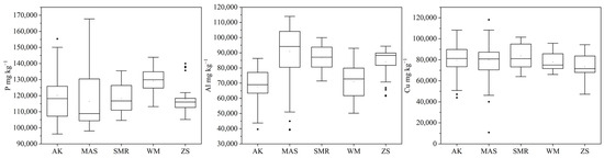 Box charts are a statistical method to display the distribution of data; the height of the box reflects the fluctuation of data to some extent. The box diagrams for the P, Al, and Cu elemental concentrations in turquoise samples from different localities are shown in Figure 2. The samples from the Sleeping Beauty mining area were found to contain highest amounts of copper, whereas the samples in Mongolia had the highest amounts of phosphorus. In general, the distributions of these three elements in samples from various producing areas were relatively concentrated, but showed some variations in element contents. In the outlier dots, the samples were still mainly composed of P, Al, and Cu, but when Al was relatively high, the contents of P and Cu decreased correspondingly. In all samples, the sum contents of the three elements reaches a dynamic balance. Although the theoretical chemical formula of turquoise defines the theoretical contents of P, Al, and Cu, the substitution of associated minerals and isomorphism may affect the distribution of the constituent elements.