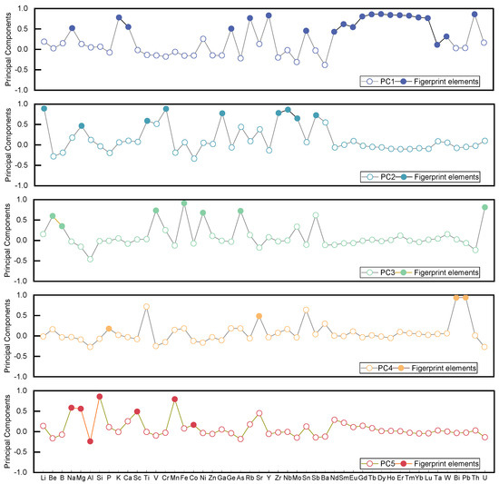 According to the load proportion (Figure 4), elements such as Na, K, Ca, Ge, Rb, Y, Sn, Ta, Th, and rare earth elements account for a large proportion in first principal component, which is consistent with the information on SMR samples in the fingerprint of Figure 3. Li, Mg, Ti, Cr, Ga, Zr, Nb, Mo, and Sb account for a large proportion in the second principal component, which is consistent with the information on ZS samples in the fingerprint. Be, B, V, Fe, Ni, As, and U account for a large proportion of the third principal component, which is consistent with the information of AK sample in fingerprint; P, Sr, Pb, and Bi account for a large proportion of the fourth principal component, which is consistent with the WM sample information in the fingerprint; Na, Mg, Al, Si, Sc, Mn, and Co have a large load in the fifth principal component, which is consistent with the information on MAS samples, SMR samples, and ZS samples in the fingerprint.