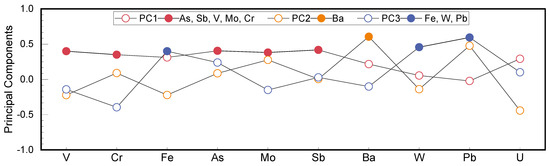 In this study, the concentrations of 10 elements (V, Cr, Fe, As, Mo, Sb, Ba, W, Pb, U) measured by LA-ICP-MS were examined by PCA. Utilizing the criterion that characteristic values should exceed the value of 1 and cumulative variance contribution rates should exceed 80%, we achieved six principal component factors through extraction and rotation factors. The total contribution rate of 82.535% indicates that the experimental data effectively capture the original information.
