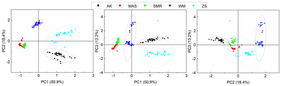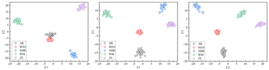 The distribution of mineral elements from different producing areas presents a certain law. In order to facilitate intuitive analysis, the first three principal components were extracted in a scatter plot (Figure 5). The partition information on samples from different producing areas cannot be clearly distinguished from the plot, and further variable extraction is needed.