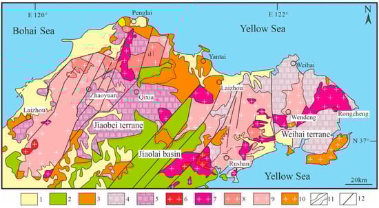 Map showing the regional geology in the Jiaodong Peninsula (modified after [,]). (1) Quaternary sediments; (2) Cretaceous sedimentary basin; (3) Paleoproterozoic and Neoproterozoic; (4) Neoproterozoic bearing eclogite granitic gneiss; (5) Archean granite–greenstone belt; (6) Late Cretaceous granite (Laoshan granite); (7) Early Cretaceous granite (Late, Weideshan granite); (8) Early Cretaceous granite (Early, Guojialing granite); (9) Late Jurassic granite (Linglong granite); (10) Triassic granitoid; (11) geological boundary of conformity/unconformity; (12) fault.