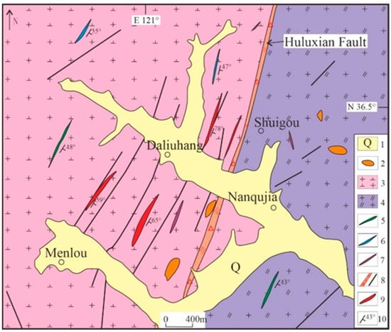 Geological map of the Daliuhang deposit. (1) Quaternary sediments; (2) Neoproterozoic; (3) Early Cretaceous porphyritic granodiorite (Guojialing granodiorite); (4) Late Jurassic granite (Linglong biotite granite); (5) quartz diorite porphyrite; (6) lamprophyre; (7) granite pegmatite; (8) fault; (9) ore vein; (10) occurrence.