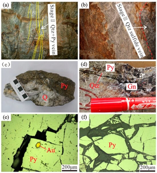 Photographs of major wall rocks and various mineralized veins in the Daliuhang gold deposit. (a) Pyrite sericite cataclastic rock and quartz–pyrite veins (Stage II); (b) quartz vein (Stage II) and its adjacent quartz–galena–pyrite vein (Stage III); (c) representative specimens of quartz–pyrite veins (Stage II); (d) representative specimens of quartz–galena–pyrite veins (Stage III); (e) euhedral pyrite and gold grains occur inside pyrite crystals; (f) pyrite with an automorphic-semi-automorphic structure. Au, gold; Gn, galena; Py, pyrite; Qtz, quartz.