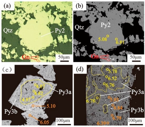 Based on the interpenetration relationship of ore veins, mineral assemblage characteristics, and observations using backscattered electron (BSE) images, the mineralization can be roughly divided into four stages: Stage I consists of pyrite and quartz, with a small amount of medium and fine-grained pyrite. Stage II contains quartz and pyrite, where white-grey quartz fills cavities, and pyrite occurs as coarse euhedral cubes (Py2), displaying a smooth surface and a single component in the backscattered electron (BSE) images (Figure 4a,b). Stage III is characterized by gold, quartz, and polymetallic sulfide phases. The quartz is grey to pale with relatively coarse particles, and the pyrite (Py3) and galena are medium-coarse-grained and more automorphic. Locally, Stage III minerals are superimposed on Py2, forming an irregular, dark inner core (Py3a) with a bright outer rim (Py3b) in the BSE images (Figure 4c,d). Milky carbonate–quartz veins represent Stage IV. Stages II and III represent the main gold mineralization episodes.