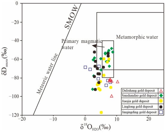 This paper conducted H–O isotope analysis on quartz samples from the Daliuhang gold deposit during its main gold mineralization episodes and collected previous research results on the Jiaojia and Jinqingding gold deposits (Table 1). The δ18O values of the hydrothermal quartz (δ18OSMOW‰) ranged from 15.8 to 18.3‰, with a median value of 16.5‰. The hydrogen isotope composition δDsmow value varied from −101.0 to −84.0‰, with an average value of −89.0‰ (Table 1). Assuming that quartz is isotopically equilibrated with the ore-forming hydrothermal fluids, the oxygen isotope composition of the ore-forming hydrothermal fluids can be estimated following the temperature-dependent quartz–water oxygen isotope fractionation equation: 1000lnαQ–W = 3.38 × 106/T2 − 2.90 [], that is, δ18OH2O = δ18Osmow − 1000lnαQ–W. The δ18OH2O value ranged from 7.63 to 10.90‰, with an average of 8.52‰. The hydrogen and oxygen isotope values of the Daliuhang gold deposit are relatively similar to those of the Jiaojia and Jinqingding gold deposits (Figure 5).