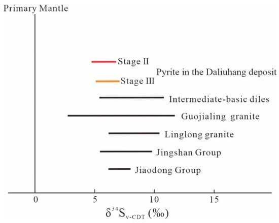 Earth has three main sources of sulfur: sulfur in the mantle, seawater, and continental crust. The average value of δ34S in the mantle is close to zero, with a variation range of 0 ± 3.0‰, and it mainly exists in a reduced state. The average value of δ34S in seawater is +20.0‰. In addition, the sulfur in crustal sources is affected by its original rock, and its δ34S may be greater or less than the value of the above two sources. The in situ sulfur isotope results of pyrite in this study show that the δ34S values were all greater than 4.82‰, and the test results generally show higher δ34S values (Figure 6), indicating that the possibility of sulfur only coming from mantle-derived magma is relatively tiny. Sulfur in ore-forming fluids mainly comes from δ34S-rich magmatic rocks [] or mantle degassing with high oxygen fugacity in the subduction zones []. The results of these two processes will have the characteristics of high δ34S values. According to previous research results, the δ34S value of pyrite in the Jiaodong Group ranges from 6.10‰ to 7.80‰ [,], in the Jingshan Group, it ranges from 5.60‰ to 9.80‰ [,], in the Late Jurassic granite, it ranges from 6.10‰ to 10.70‰ [,,], in the early Early Cretaceous porphyritic granodiorite, it ranges from 2.7‰ to 11.8‰ [,], and in the intermediate–basic dike rocks, it ranges from 5.30‰ to 10.80‰ []. The δ34S values of pyrite from the Daliuhang gold deposit overlap somewhat with the δ34S values of all types of rocks, and in general, overlap more with the Jingshan Group, Early Cretaceous porphyritic granodiorite, and intermediate–basic dike rocks. The δ34S value of pyrite (Py3) in Stage III is slightly higher than the pyrite (Py2) in Stage II, which indicates that new sulfur was added to the mineralized hydrothermal fluids as mineralization proceeded. A large number of isotopic exchanges were presumed to exist between the mineralized fluids and host rocks. It can be assumed that during the thinning and melting of the lithospheric mantle, the enriched volatile fraction promoted the release of δ34S. In contrast, the δ34S in the surrounding rock was extracted when the fluid rose to the location of the enclosing rock, and the two effects resulted in the generation of high δ34S values.