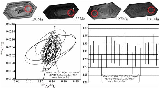Zircon crystals from the Early Cretaceous porphyritic granodiorite are generally euhedral, pale yellow, and translucent. Most of them are equiprismatic to prismatic, with a few short columnar grains. Most of the grains are 100 to 200 μm in diameter, but a few grains are 300 to 400 μm in diameter. Based on cathodoluminescence (CL) images (Figure 7), magmatic oscillatory zoning is present in most grains. However, some zircon cores are residual. Many of the residual cores show signs of partial melting and are clearly bounded by oscillatory zones. A total of 26 spots were analyzed in the regions with oscillatory zoning. All analyses agree on a weighted average 206Pb/238U age of 130.35 ± 0.55 Ma (Figure 7).