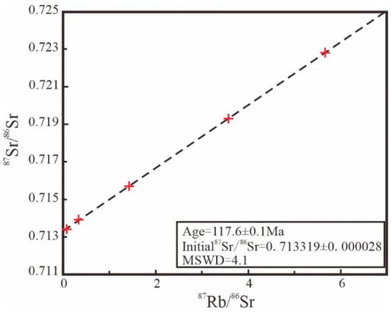 The mass fractions and isotope ratios of Rb and Sr in pyrite from the Daliuhang gold deposit are listed in Table 5. The Rb and Sr mass fractions were 0.1369–6.2452 ppm and 0.9369–19.8666 ppm, respectively. The 87Rb/86Sr ratios ranged from 0.0446–5.6666, and the 87Sr/86Sr ratios ranged from 0.71340 to 0.72280. The graphs of 87Rb/86Sr and 87Sr/86Sr for pyrite in the Daliuhang gold deposit show an excellent linear relationship. ISOPLOT software was used to calculate the isochron age, which was t = 117.60 ± 0.10 Ma, and the initial 87Sr/86Sr (Isr) value was 0.713319 ± 0.000028 (Figure 8).