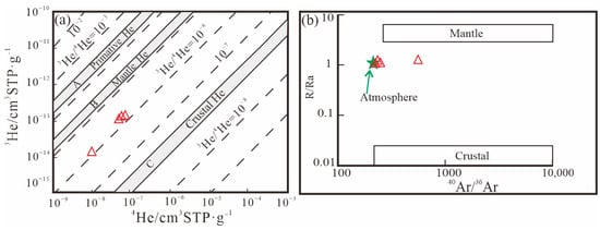 (a) Helium isotopes of pyrite from the Daliuhang gold deposit. A–C From Mamyin and Tolstikhin (1984) []; (b) He (R/Ra) vs. 40Ar/36Ar diagram for fluid in pyrite from the Daliuhang gold deposit. Values of crustal and mantle end-members [,,,].