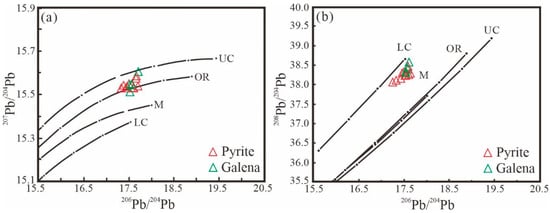 207Pb/204Pb vs. 206Pb/204Pb diagram (a) and 208Pb/204Pb vs. 206Pb/204Pb diagram (b) of sulfides from the Daliuhang gold deposit (after []). Abbreviations: LC, lower crust; UC, upper crust; M, mantle; OR, orogenic belt.