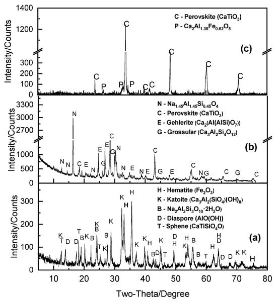 The X-ray diffraction patterns (XRD) indicated that the diffraction peaks of hematite in the BR disappeared in the non-magnetic material after the reductive roasting and magnetic separation process. The Al- and Si-bearing minerals in the BR were dehydrated and further transformed into sodium aluminosilicates, grossular, and gehlenite in the non-magnetic material, as shown in Figure 2b. At the same time, a new mineral of perovskite was formed in the non-magnetic material. As a two-step leaching process was further conducted on the non-magnetic material, most of the Al- and Si-bearing minerals were dissolved, and their diffraction peaks disappeared in the leached residue, namely the IBR. The XRD patterns indicated that the IBR mainly comprised perovskite, as shown in Figure 2c.