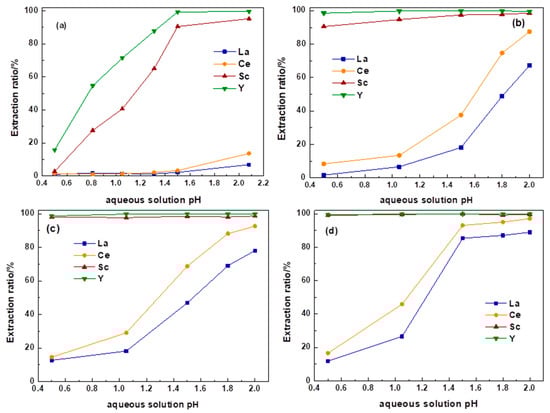 At the same time, it was observed that La and Ce exhibited distinct behaviors compared with Sc and Y. As can be seen in Figure 3a, limited quantities of La and Ce were extracted over the course of the experiment and their extraction ratios were basically lower than 10% as P204 was at a low concentration of 2%. The extraction ratios started to increase gradually with increase in the concentration of P204. The aqueous solution pH was also beneficial for the extraction of La and Ce, as shown in Figure 3b–d. Inferior extraction of La and Ce occurred when the concentration of P204 was less than 15%, with the extraction ratios being less than 80%, even at a high solution pH of 2.0. Optimal extraction of La and Ce was obtained when the concentration of P204 was 20% at pH above 1.5. The extraction ratios of La and Ce reached about 87% and 95%, respectively, at solution pH of 1.5, and further increased to 92% and 98% at solution pH of 2.0.