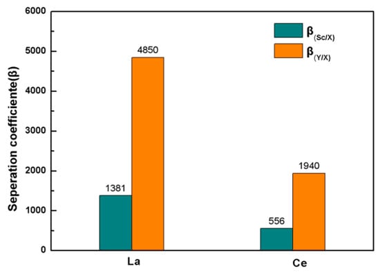 According to the results obtained, higher concentration of P2O4 of about 20% enhanced the separation of La and Ce against the impurities. The results are shown in Figure 6b. Although the separation coefficients observed for La and Ce against the impurities were not as high as those for Sc and Y, their values were far higher than 1 and were significantly improved to 3–50. The results demonstrate that the separation of La and Ce against the impurities could be realized under this condition.