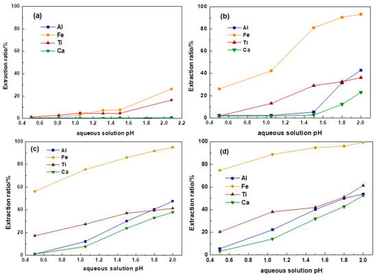 Increasing the concentration of P204 and the solution pH values facilitated the extraction of impurities. The results are shown in Figure 5b–d. When the concentration of P204 was 20%, the extraction ratios of Al and Ca were less than 5%, while those of Fe and Ti attained 74.7% and 20.4%, respectively, at solution pH of 0.5. When the initial solution pH value increased to 2.0, the extraction ratios of Fe, Al, Ti, and Ca attained about 98%, 61.4%, 53.2% and 52.5%, respectively.