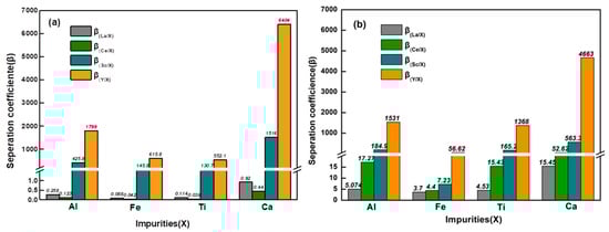 The separation coefficiency () characterizes the separation difficulty of the REEs against impurities in the solvent extraction process. It is calculated based on the distribution ratio of the rare earth and impurity element in the solvent extraction process, according to Equation (3).