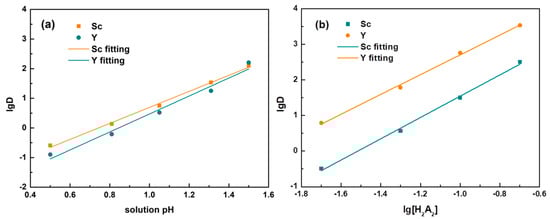 To ascertain the reaction of Sc and Y in the phosphoric acidic leachate with P204, the fitting curves of lgD(Sc or Y) against the solution pH at a P204 concentration of 2%, as well as lg[H2A2] at an solution pH of 1.5, were plotted, as shown in Figure 7a,b, respectively. It should be noted that the initial aqueous solution pH dropped little after the reaction equilibrium was reached when 2% P204 was used as the extractant. This was because the content of the rare earth elements was extremely low in the acidic leachate and few impurities were extracted with 2% P204.