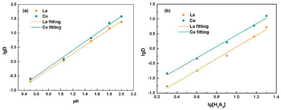 The relationship of (a) lgD–pH and (b) lgD–lg[] for La and Ce.