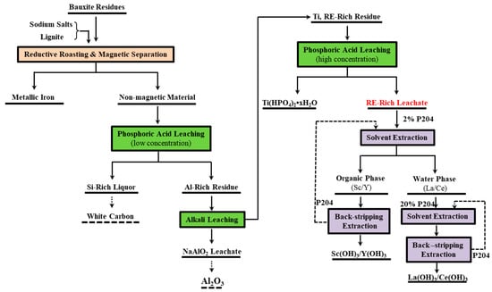 The proposed extraction/back-stripping process for REEs extraction can be combined with a procedure used in our previous work [32,33,34] for the stepwise extraction of iron, silica, and alumina titanium with suitable acidic pre-treatment of the bauxite residue. The whole flowchart is presented in Figure 9. Comprehensive extraction of the dominant valuable components in the bauxite residues is enabled through the process shown in the flowchart. In the future, this routine is anticipated to be scaled up and industrialized as the bauxite residue is fully utilized and zero solid waste is produced. As a result, the storage of bauxite residues will be greatly reduced and the pollution stress arising from it on the surrounding environment can be further eliminated.