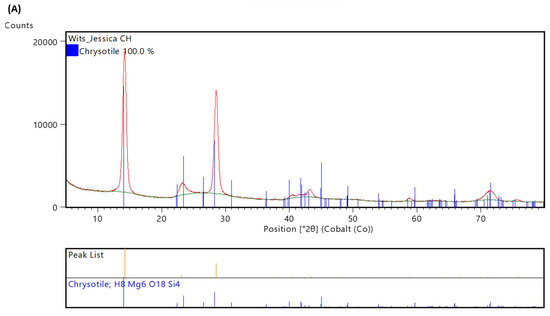 The relative intensity and d-spacing calculated for the chrysotile, amosite (grunerite) and crocidolite (magnesio-riebeckite) phases (Table S1) correspond to those of the known principal lattice spacings for each of the asbestiform minerals [57]. The Rietveld refinement data are shown in Table 3.